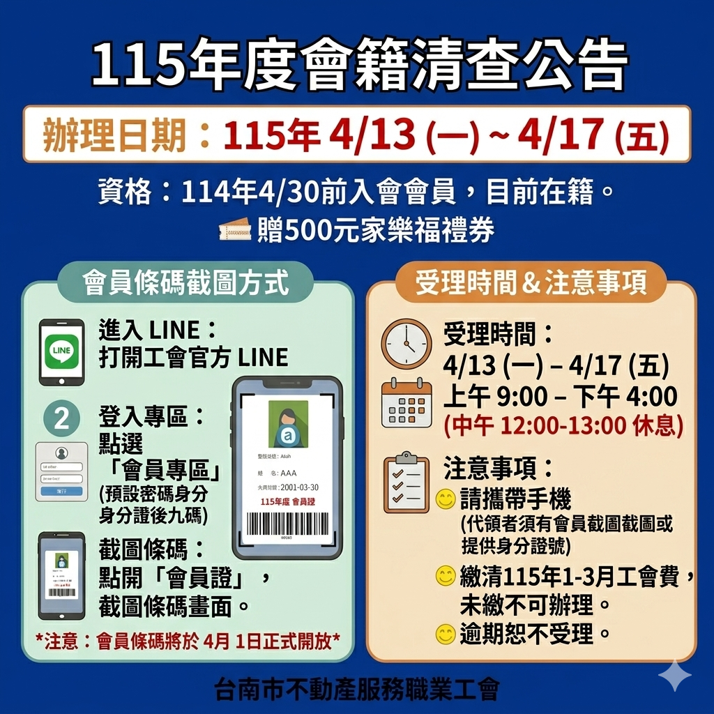 本年度會籍清查於【115年4月13至4月17日】開始